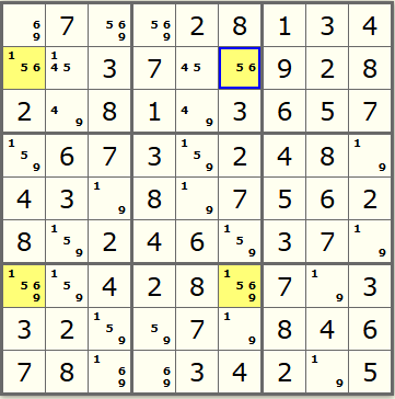 in row2 and row7 (6) can only belong in column1 and column6. Because the x wing will require a 6 in the highlighted cells, Row1 Column1 can not have a 6 and must be a 9.